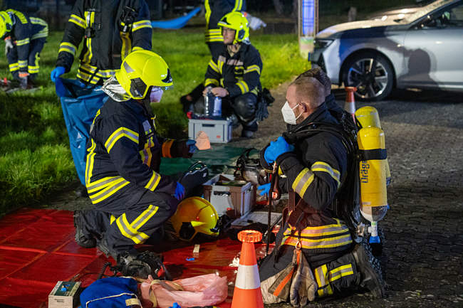 Vor Ort eingetroffen wurden die Einsatzkräfte durch einen Einweiser in Empfang genommen. Der unter Schock stehende Mann, welcher über starke Schmerzen am Unterarm und Atemnot klagte, gab den Einsatzkräften den Hinweis, dass es in einer Halle zu einer Verpuffung gekommen sein und sich noch mindestens zwei weitere Personen in der Halle befinden sollten.