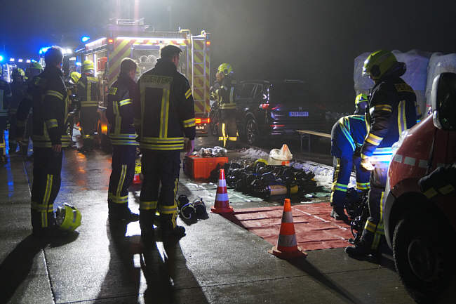 Im Einsatzverlauf kamen insgesamt zwei Drehleitern, eine Hubrettungsbühne, mehrere handgeführte Strahlrohre sowie ein Monitor zum Einsatz. Die Löschwasserversorgung stellte aufgrund der hohen Brandlast und des massiven Kräfte- und Mitteleinsatzes eine besondere Herausforderung dar und wurde über insgesamt fünf Löschwasserentnahmestellen sichergestellt. Nach etwa drei Stunden konnte gegen 08:00 das Feuer im Außenbereich so weit gelöscht werden, dass eine Erkundung des Innenraumes möglich wurde. Hierbei kam unter anderem ein Fachberater des THW zum Einsatz, der die Statik des Hallendachs beurteilte und bestätigte, dass die Halle weiterhin betreten werden konnte.